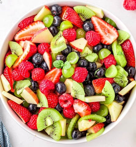 In a large bowl combine the strawberries, blueberries, raspberries, kiwi, grapes, and apple. Set aside.
